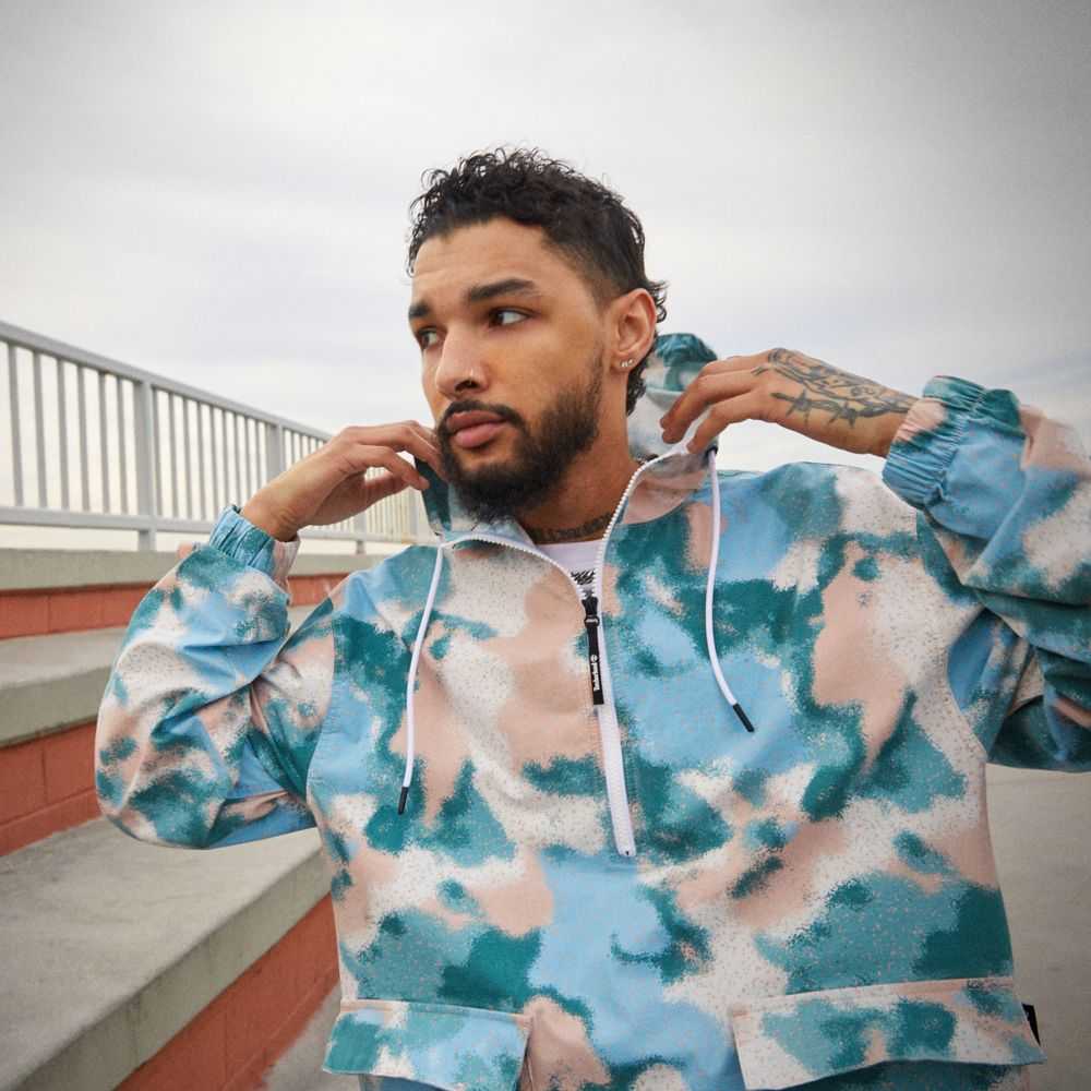 Worksite-inspired design at the edge of utility.Made with a touch of stretch for comfort,this men's anorak features a distinctive allover print,a half-zip opening,adjustable hood,cargo front pockets,and fabric containing 98% cotton grown without harmful chemicals or pesticides.